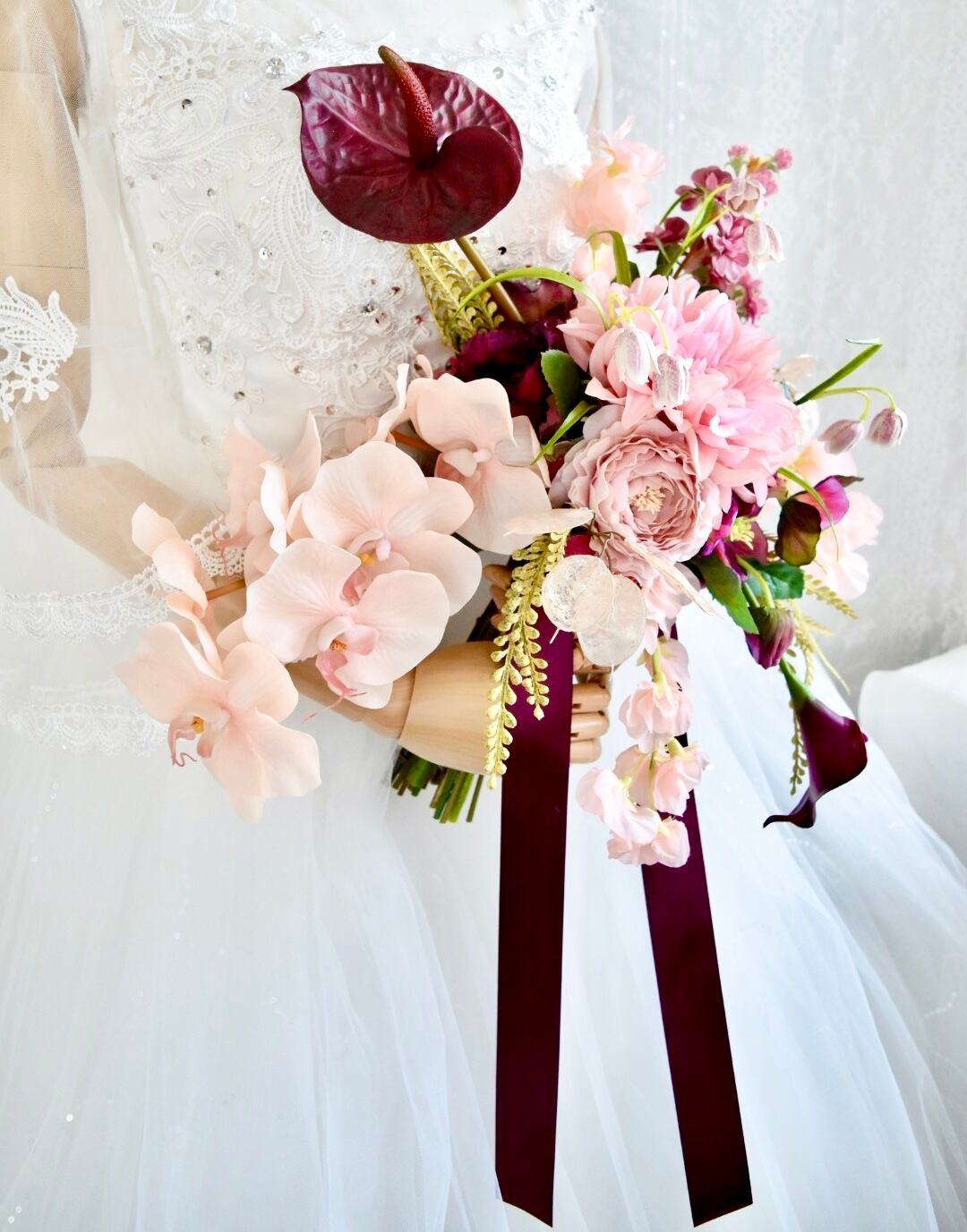 NEW*即納OK ソフトピーチなコチョウラン~ボルドーのクラッチブーケ